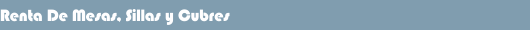 Mesas: Mesas Larga, sienta 8-10 Invitados: $ 10.00 Mesas cuadradas, sienta 2-4 invitados: $ 5.00 Mesa Redonda, sienta 8-10 invitados: $ 10.00 Mantelería: Poliéster Comenzando des de $ 10.00 cada uno 64 colores disponibles Más materiales disponible Overlay: Poliéster: Comenzando des de $ 8.00 cada uno 55 colores disponibles Más materiales disponibles Corredor de mesa: satén: Comenzando Desde $ 4.00 47 colores disponibles Más material disponible Servilletas: Poliéster: 10 por $ 5.00 55 colores disponibles Más material disponible Sillas: $ 3.00 cada uno Cubre Sillas cin Moños Satén: $ 3.00 Cada uno Otros colores disponibles Más materiales disponibles Moños: A partir de $ 2.00 Mas colores disponibles Más materiales disponibles Numero De Mesa Stand: $2.00 Cada Uno