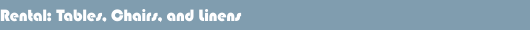Tables:Long Table, Sits 8-10 Guests: $10.00Square Tables, Sits 2-4 Guests:$5.00Round Table, Sits 8-10 Guests:$10.00Table Linens:PolyesterStarting from $10.00 Each 64 Colors AvailableMore Materials Also AvailableOverlay: Polyester: Starting From $8.00 Each55 Colors AvailableMore Materials AvailableTable Runners: Satin Starting From $4.0047 Colors AvailableMore Material Available Napkins: Polyester: 10 for $5.00 55 Colors Available More Material Available Chairs: $3.00 Each Polyester Chair Covers With Satin Sash:$3.00 EachOther Colors Available More Materials Available Sashes: Starting from $2.00All Colors Available More Materials Available Table Number Stand:$2.00